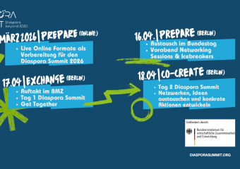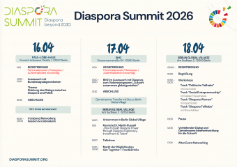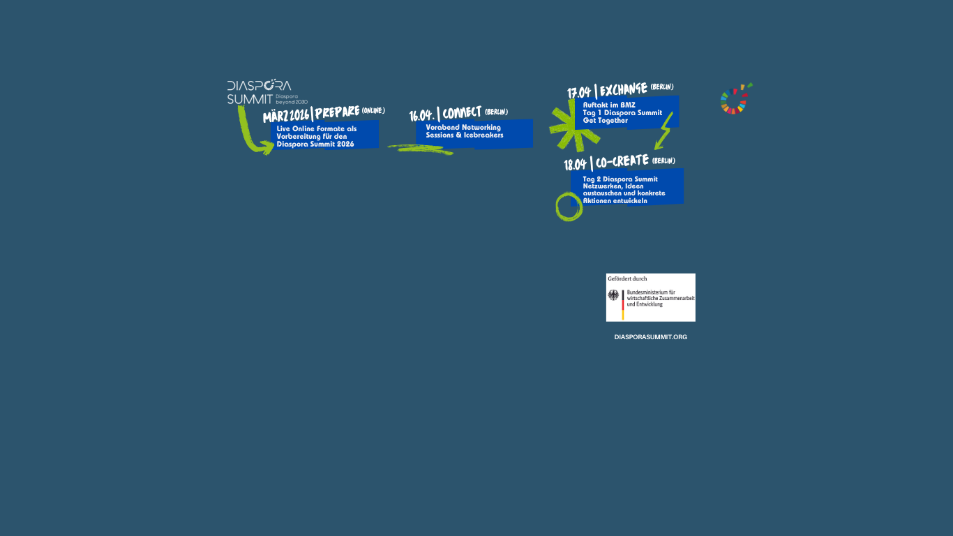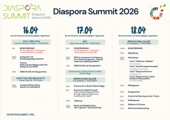 Der Diaspora Summit bietet einen Austausch-Raum an, um eine Plattform für diasporische Akteure zu generieren, um die gegenseitige Stärkung und Entwicklung zu fördern. Dabei werden Forderungen formulieren, um mit politischen Verantwortlichen zu diskutieren und zu verfolgen. Das Diaspora Summit generiert konkrete Lösungsansätze mit Entscheidungsträger aus der Politik und mit Vertreter*innen von Bundesministerien. Wir freuen uns! […]